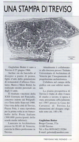 Guglielmo graduated in Architecture on July 23, 1997, took a rest flying in the USA during the summer and come back to serve at Italian Army for a year, in Cerveteri, near Rome. In October 1994 he started his career as an architect opening a studio in the Main Street of Treviso with a couple of young colleagues. At the biginning of 1997 Guglielmo decided to marry Paola and this was an opportunity to think about his future life. In the meantime begun a new graphic design, drawing his beatiful hometown from the point of view of a bird, a real gamble. In those last years of the Millennium there was still no Google Map and Guglielmo had to go personally on the towers of the churches to take pictures and make sketches from the high. After three and a half months of hard work, the perspective map of Treviso was presented to the press on November 30. It was from 1800 that no one had attempted to draw the city with a view of this complex. The original 300 copies in full scale are all sold: printed copies are aveilable in size 140 x 80 cm directly from the author.